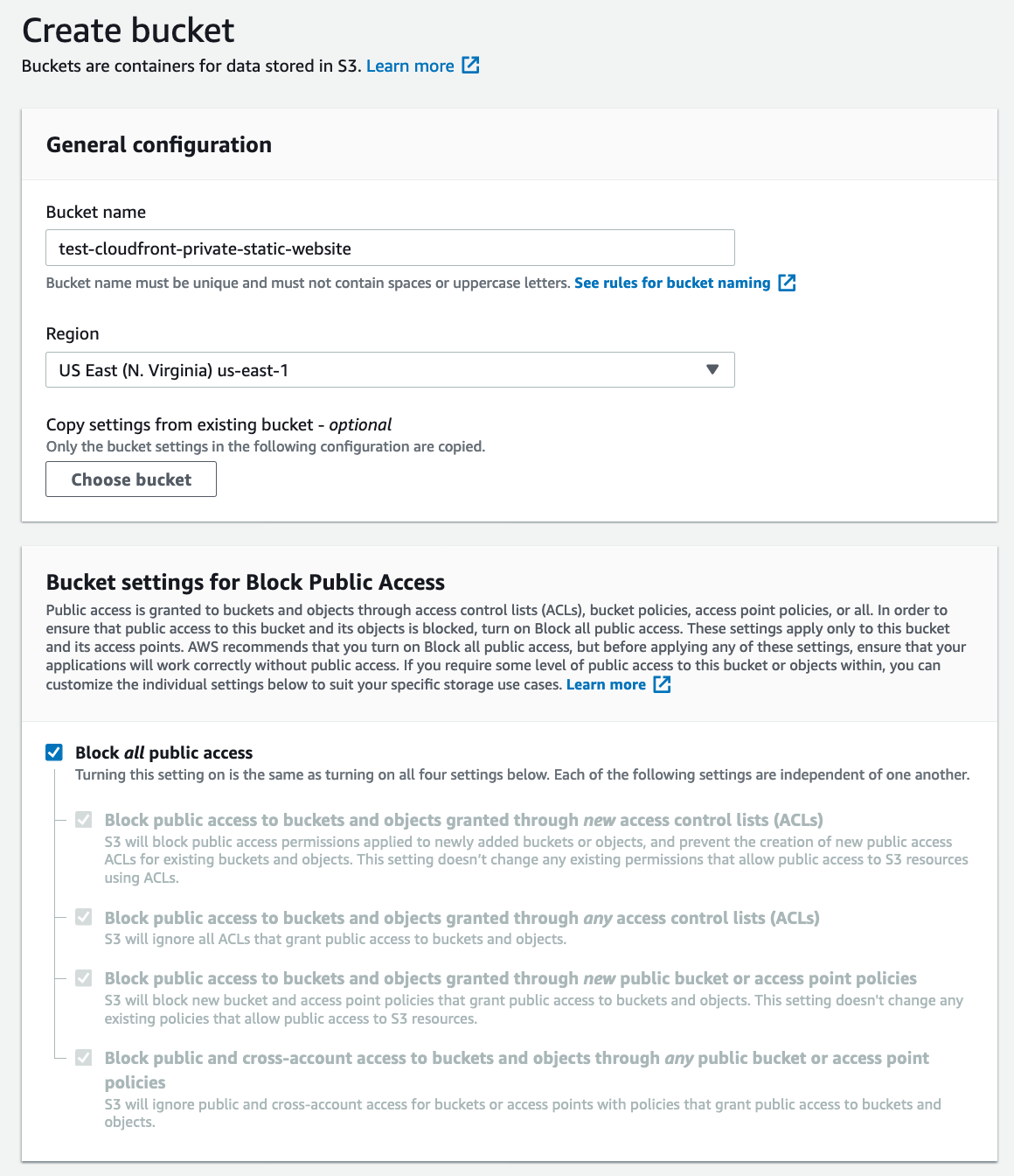 First, set up a new S3 bucket, ensuring that all public access is disabled:
