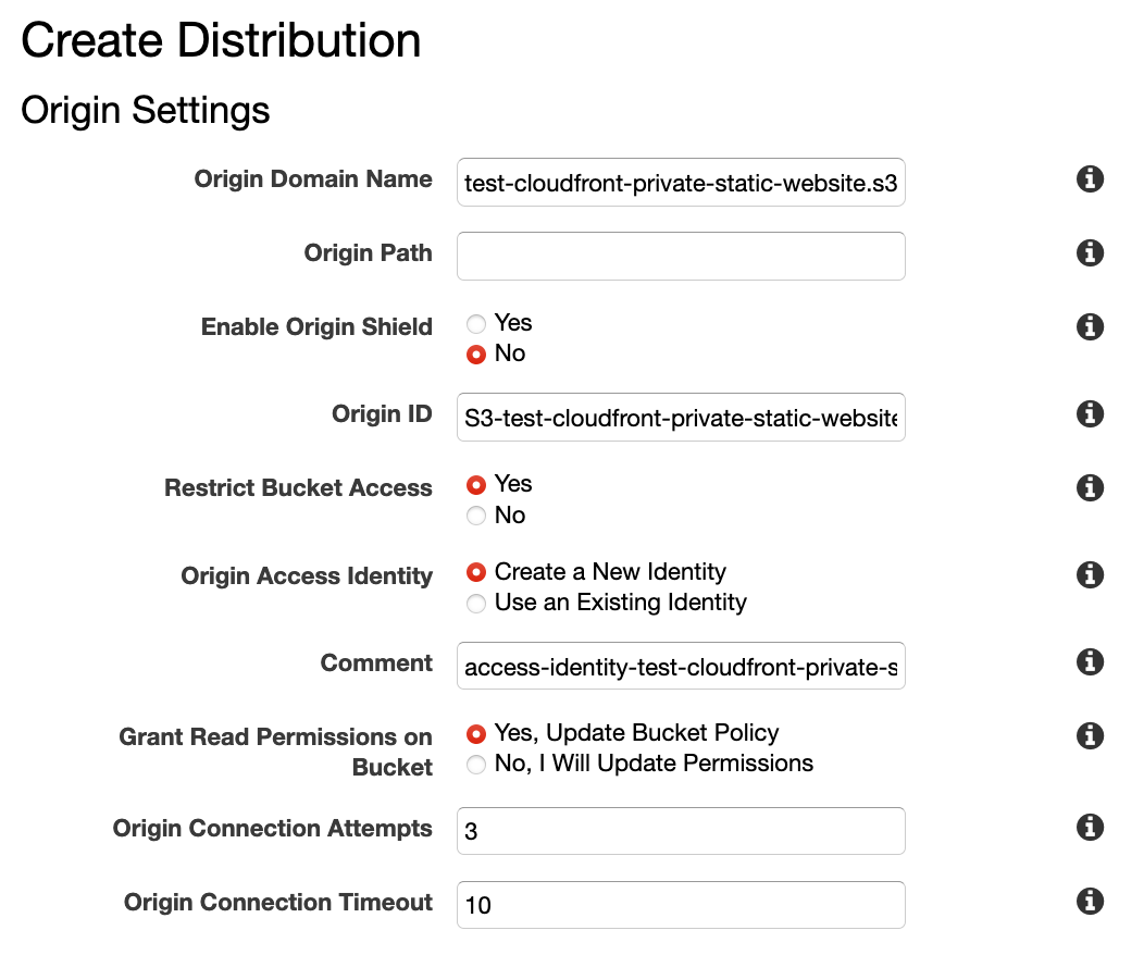 Finally, create the Cloudfront distribution. Set the origin to the S3 bucket, and ensure that Restrict Bucket Access is enabled.