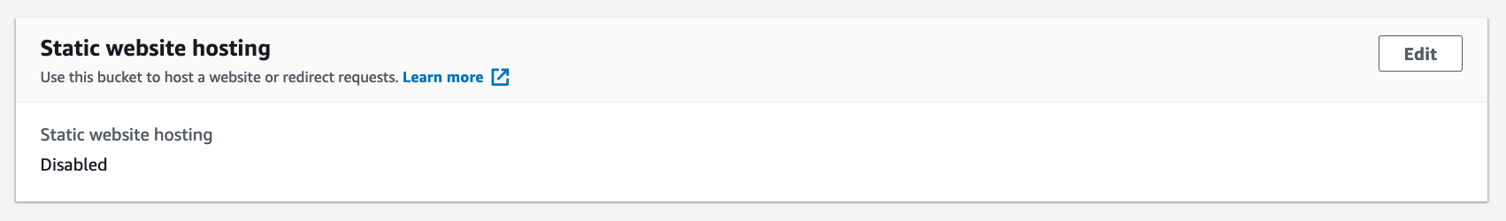 Importantly, (once the bucket is created) make sure that the Static website hosting setting is disabled; we want all incoming requests to be routed through Cloudfront, and enabling Static website hosting will allow direct HTTP requests to the bucket.