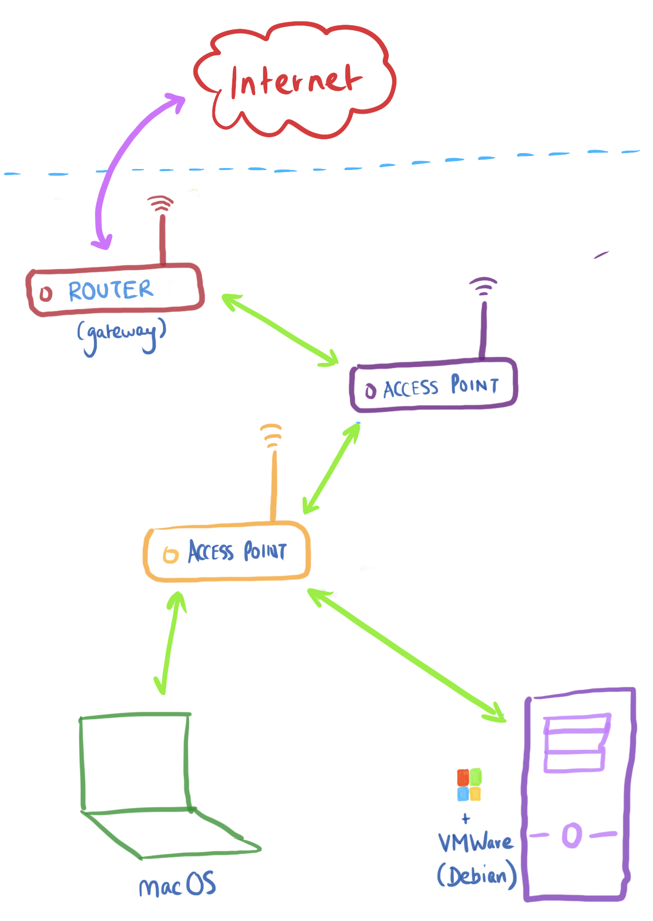 With this arrangement, every connection between my laptop and home server needs (at the very least) to go through the closest wireless access point, which can be quite slow. In addition, I have to tether my laptop to the internet via a mobile hotspot when my ISP occasionally has issues. I don’t really want to tether my home server to the hotspot, so in this case the laptop and server are completely cut off from each other.