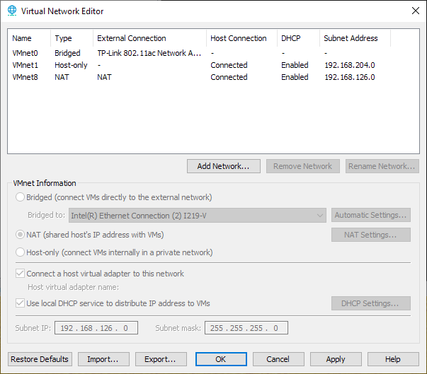 With VMWare Workstation open, navigate to Edit > Virtual Network Editor, and add a virtual network representing this new wired “network”: