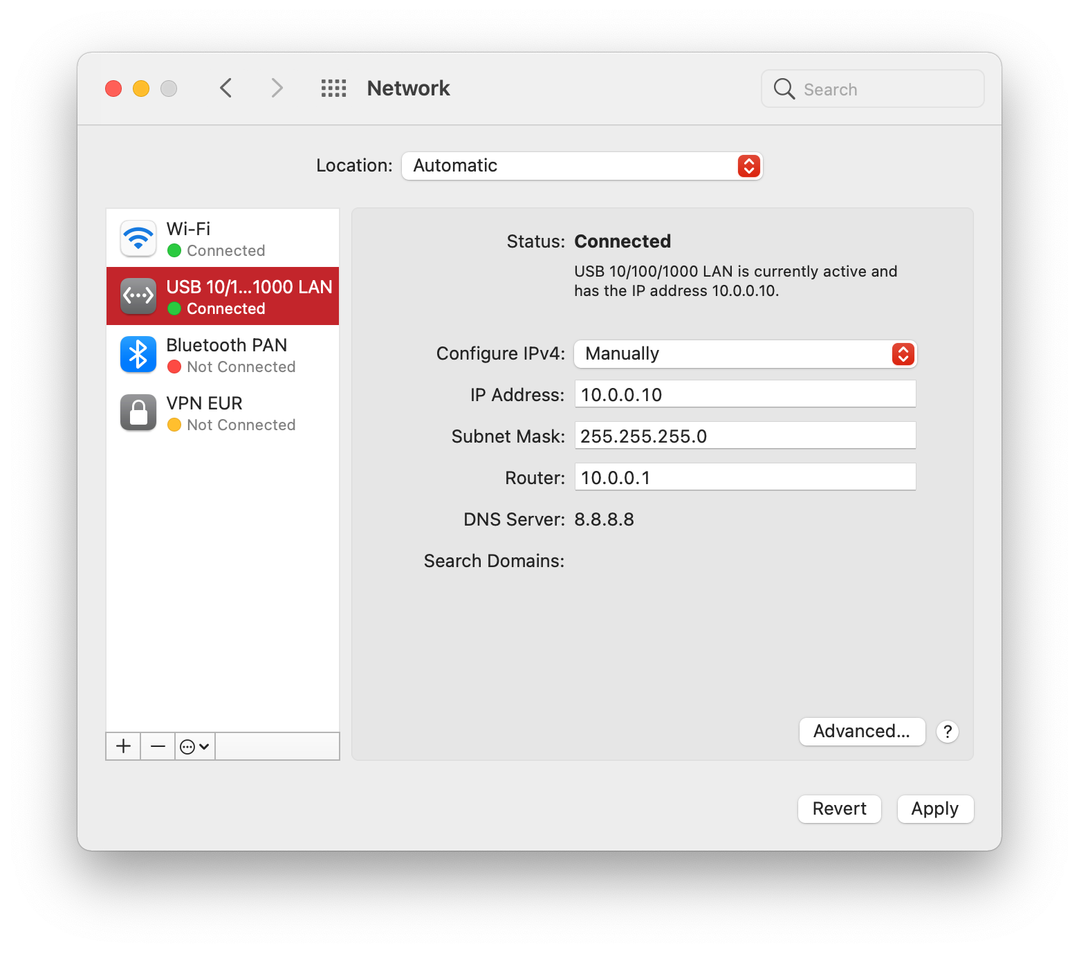 Next, it’s easy enough to set up the laptop so it has a static IP on this wired “network”: