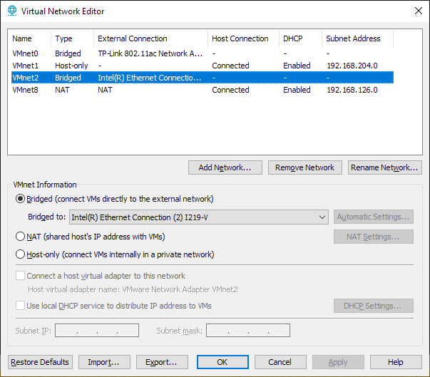 Now for the interesting bit. Add a new virtual network to VMWare representing this wired “network”.