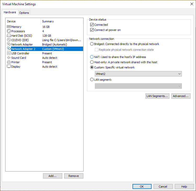 With that set up, add a second network adapter to each individual VM that needs access to this wired “network”, linking it to the virtual network that was created 👆: