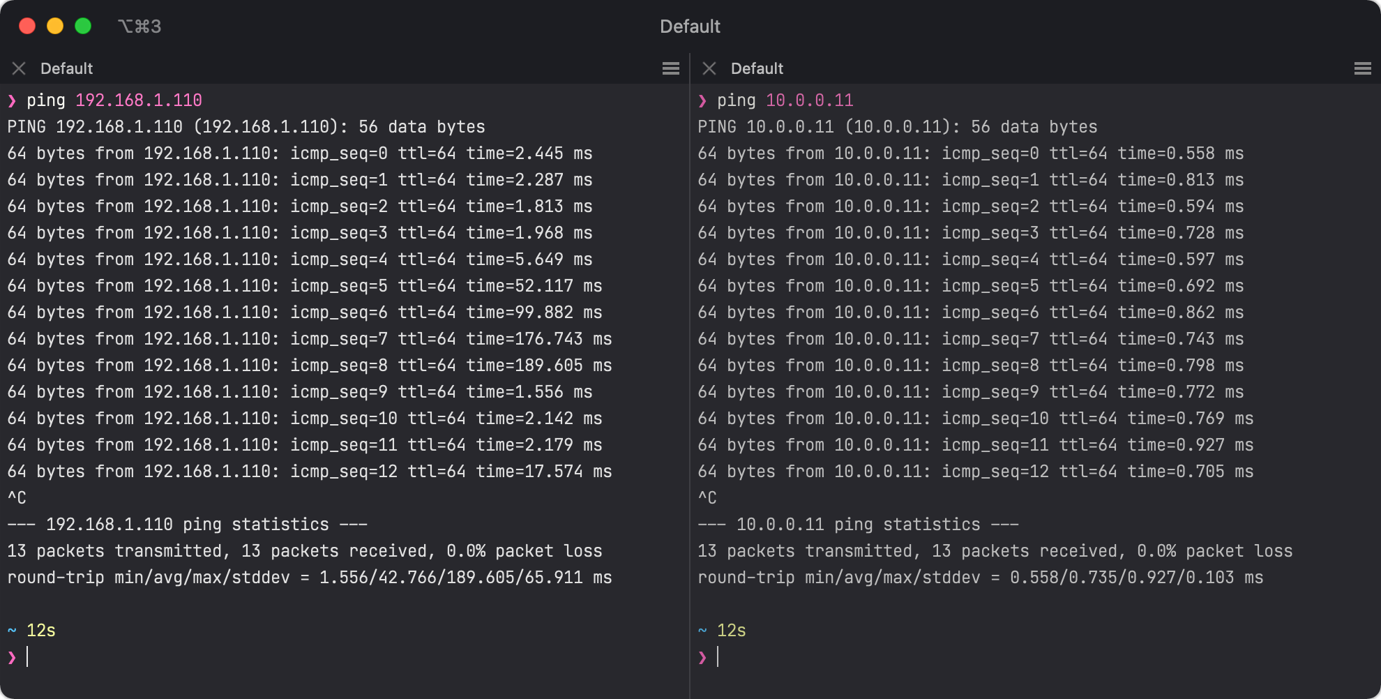 That’s now sufficient to allow my laptop to access the VPN over the wired connection. I’m much more concerned about latency than throughput with this setup, so these numbers seem promising (wireless on the left, wired on the right); it looks like a 3-4x improvement on average:
