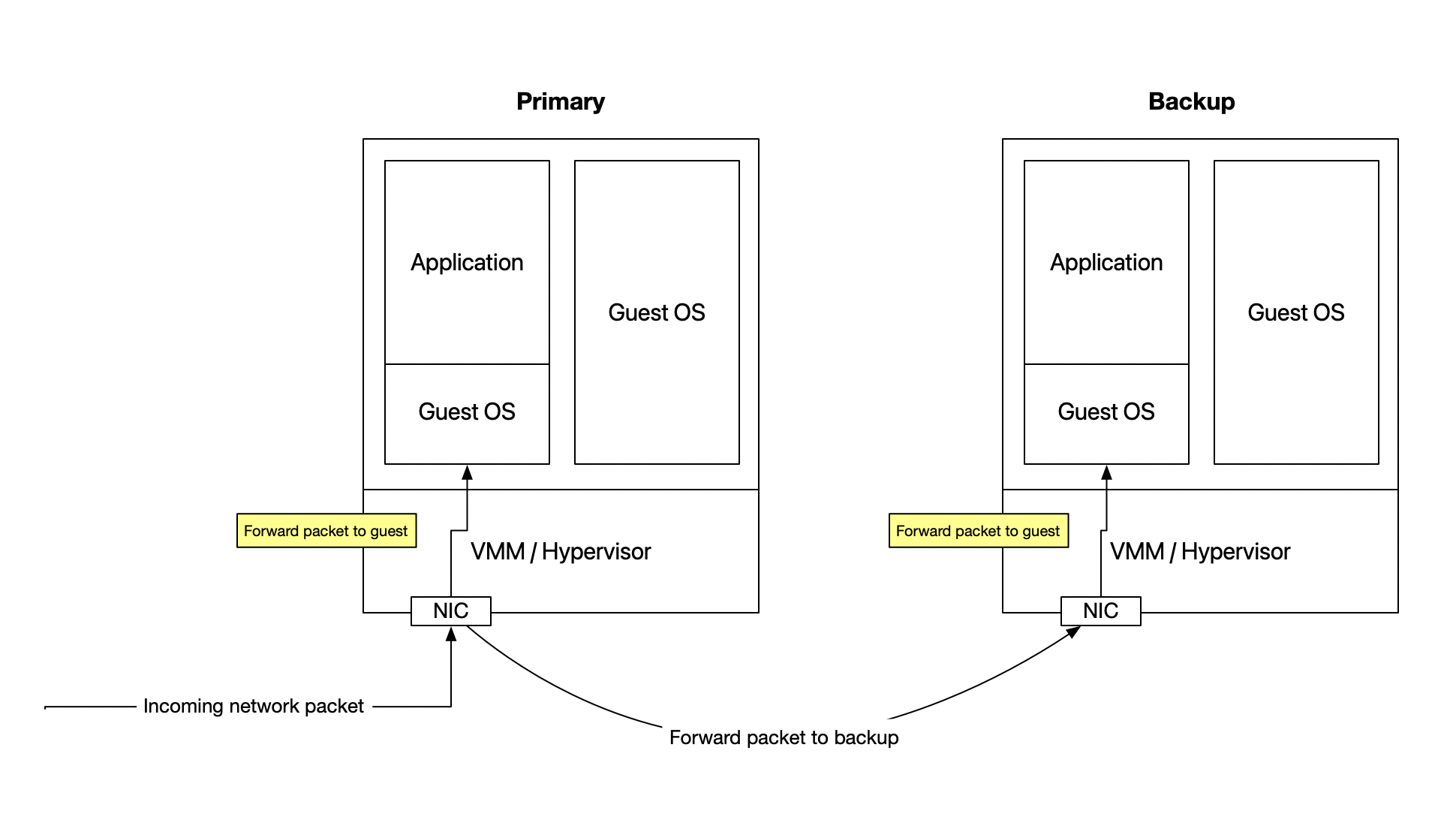 • Interrupts generated by incoming network packets (must occur at the same CPU instruction on both VMs)