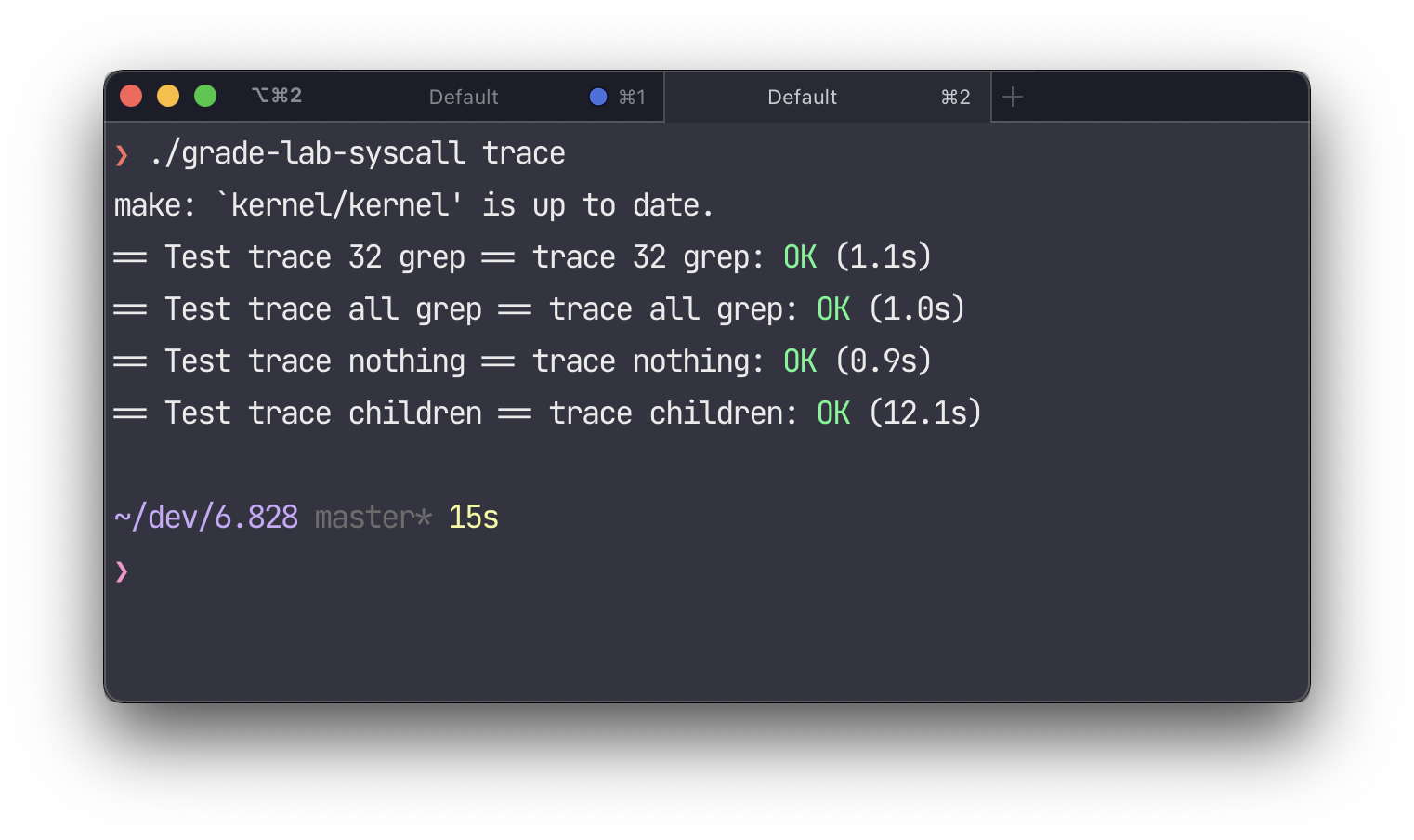traceupdates the mask, andsyscall.cchecks the mask before executing a syscall. proc.hmarks some bits of the process state as " p->lock must be held when using these"; why?user.hdefines the syscall stub implemented byusys.pl, andkernel/defs.hdefines the syscall implementation inproc.c.- This is actually working! 😮