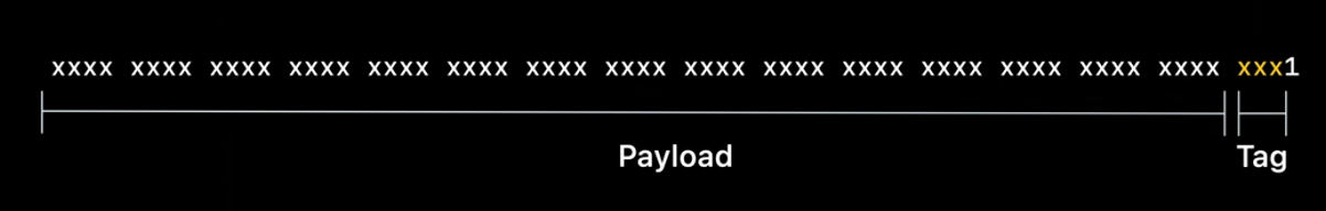 • A pointer with the lowest bit set to 1 is not a regular pointer but a tagged pointer (this is Intel; ARM is flipped because of endianness). 2020-07-27.12.00.25.png