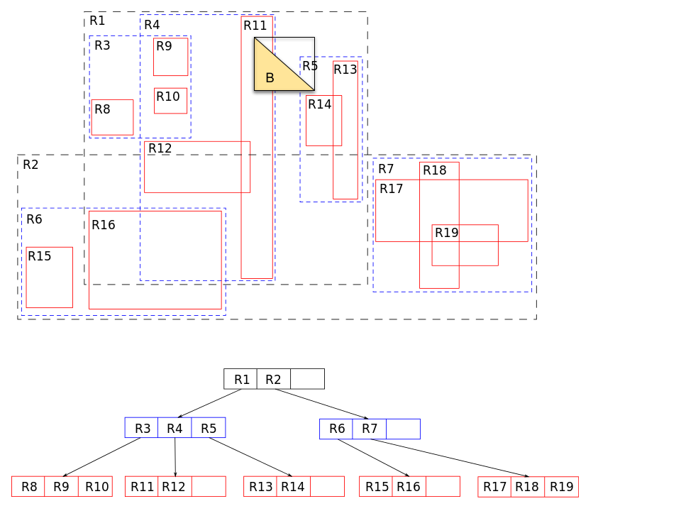 when an object/shape is indexed, a “covering” shape(s) (e.g. a bounding box) is constructed that completely encompasses the indexed object. Index queries work by looking for containment/intersection between the covering shape(s) for the query object/shape and the indexed covering shapes. This retrieves false positives but no false negatives.