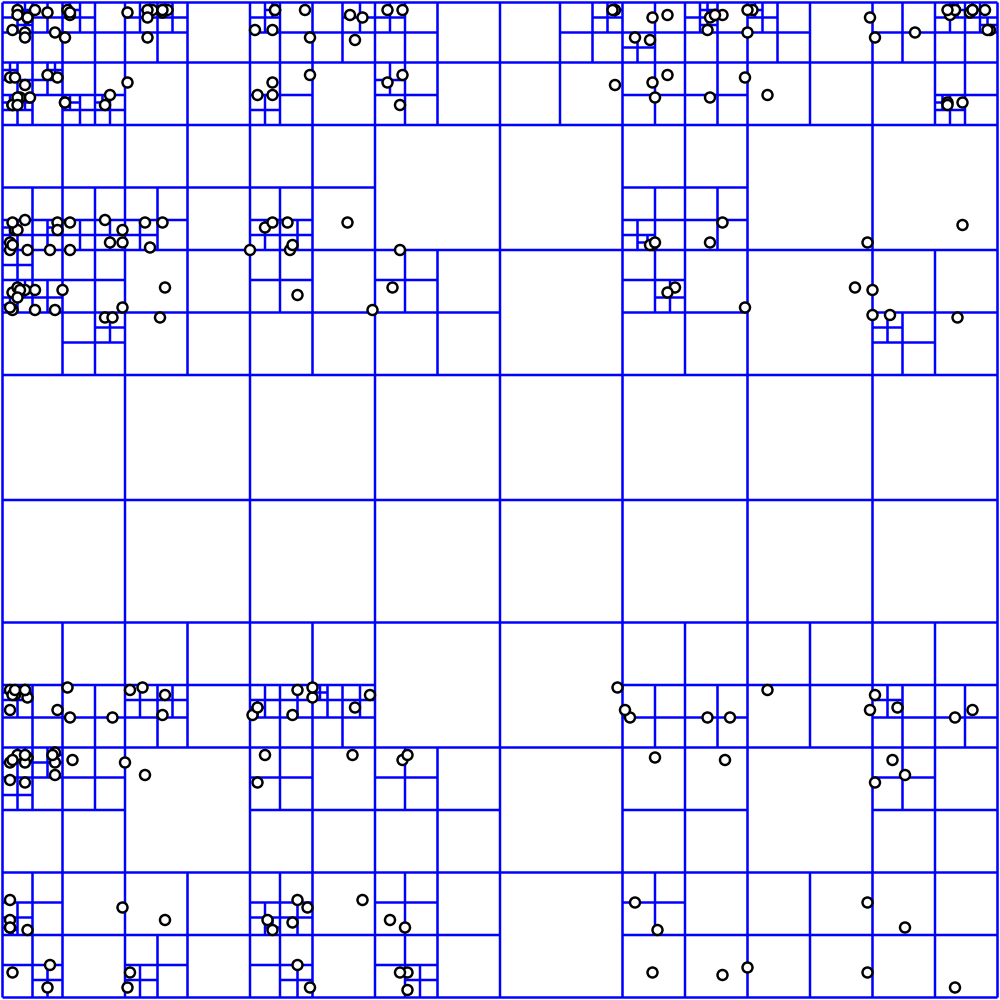 The other approach for spatial indexes is to “divide the space” into a quad-tree (or a set of quad-trees) with a set number of levels and a data-independent shape. Each node in the quad-tree (a “cell”) represents some part of the indexed space and is divided once horizontally and once vertically to produce 4 children in the next level.