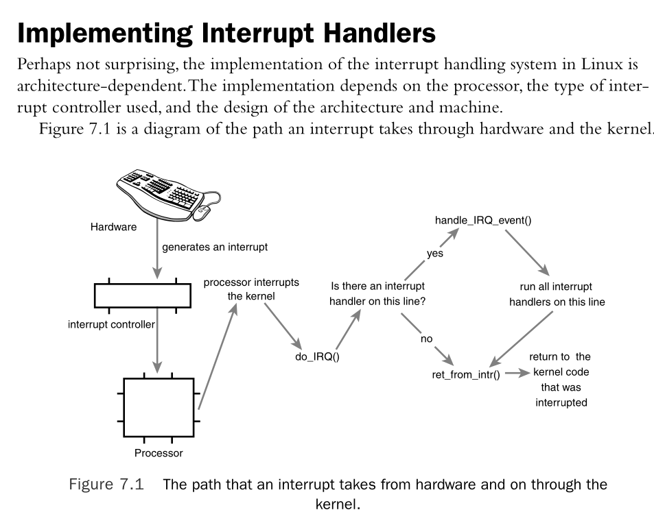 Hardware raises interrupts, interrupting the kernel, which responds by invoking the appropriate interrupt handler in an _interrupt context