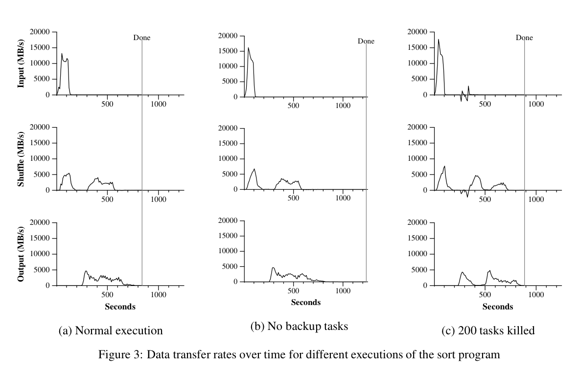 - When the entire job is close to completion, the master schedules backup executions of the remaining in-progress tasks, and output from either the backup or the original executions can be used.