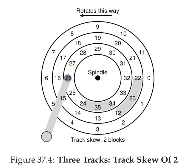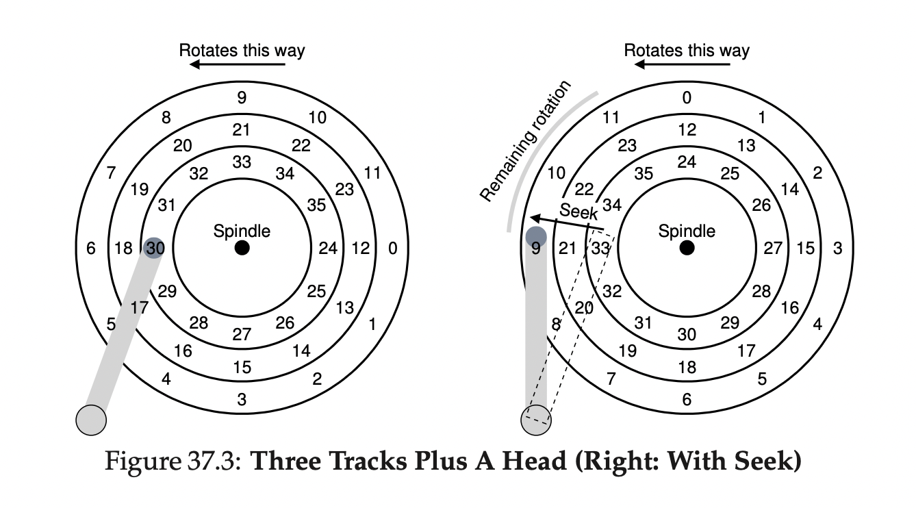 - Elevator: iterate over tracks, any requests for previous tracks have to wait until the next go-round. Rotation is ignored and could make things slower