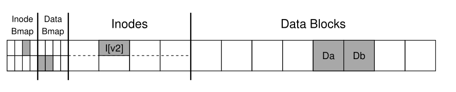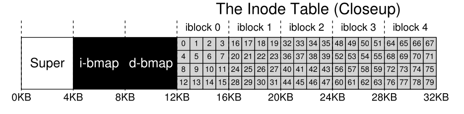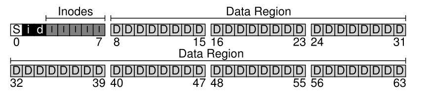 - S: superblock, i: inode bitmap, d: data bitmap, i: inodes, D: data