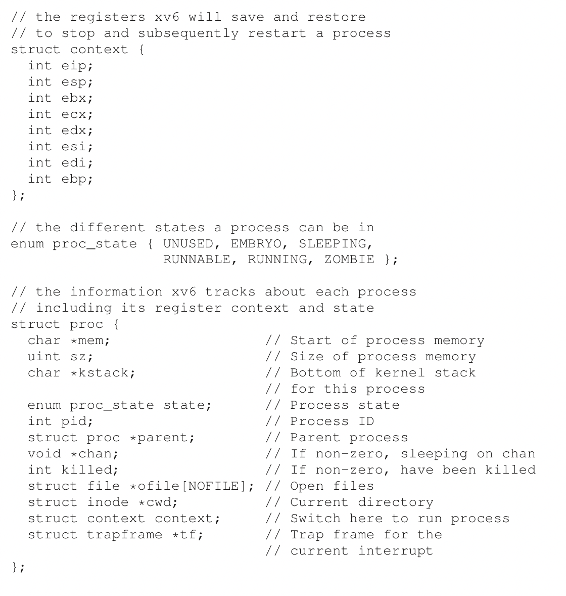 - Process List: running/blocked processes + metadata (proc on xv6 and