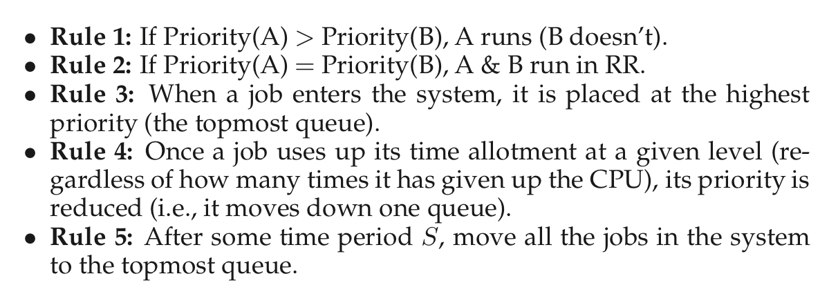 - So instead the scheduler remembers how much a process has used the CPU on a given priority level, and makes the demotion decision based on this total time.