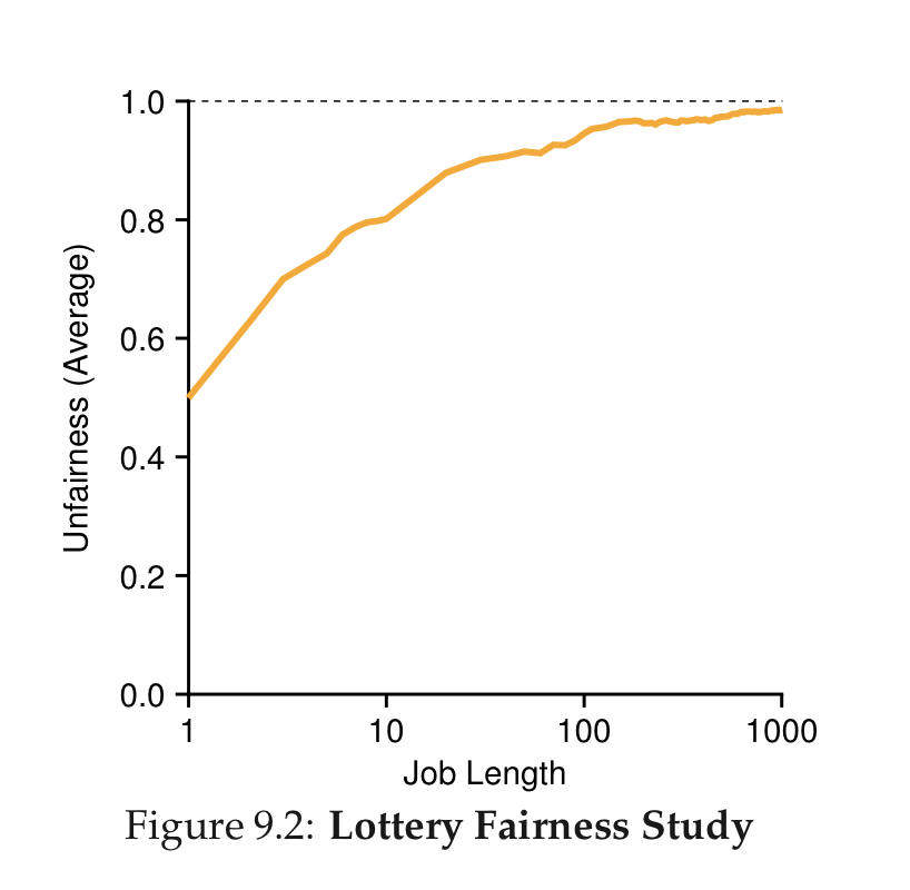 - Unfairness can be a problem for short-lived jobs, but longer-lived jobs are more likely to be scheduled according to the proportion of tickets they hold