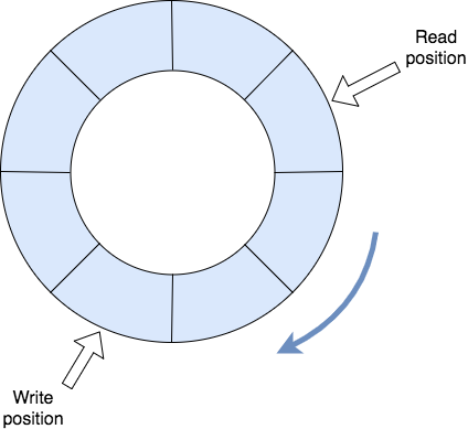 Ring buffer (…) is basically a linear data structure in which the end points to the beginning of the structure. It’s easy to reason about it as a circular array without the end.