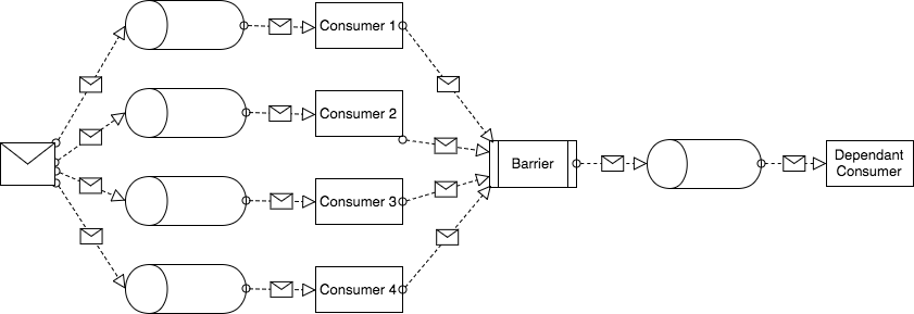 As you can see, we have a single message being sent to the input queues of multiple consumers (1-4) - so it’s a typical multicast (sort of publish and subscribe semantics). Then we have a barrier - we want all consumers to finish processing the message before we move to the next step. When the barrier is passed, the message goes to the input queue of the last consumer.