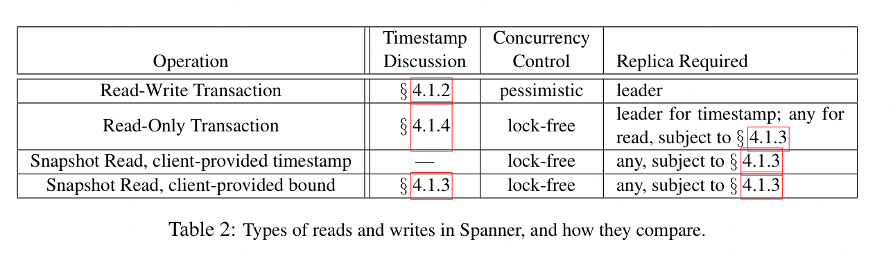TT.now().latestand uses that absolute timestamp to perform reads against multiple replicas - This requires waiting, and Spanner can probably do better by negotating a “latest common timestamp” between all involved replicas, but this is unimplemented as of the paper’s writing