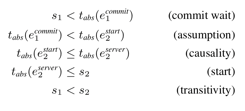 - Say $s_i$ represents the commit timestamp of $T_i$, and $e_i^{start}$ & $e_i^{commit}$ represent the start and end commit events for $T_i$. The invariant ($e_2^{start} > e_1^{commit} \implies s_2 > s_1$) is enforced by:
