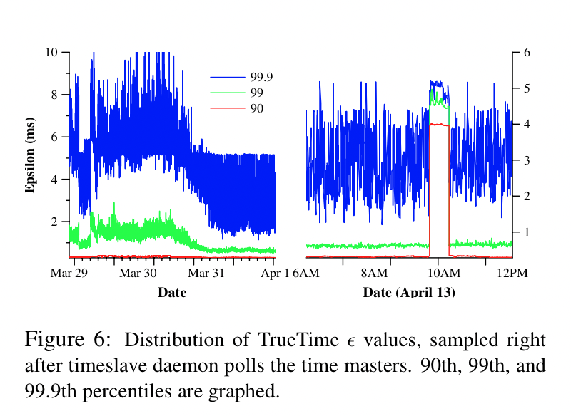 - TrueTime: how is network latency accounted for? Are we talking about the time the daemon recieved the request or the time the master received the request?