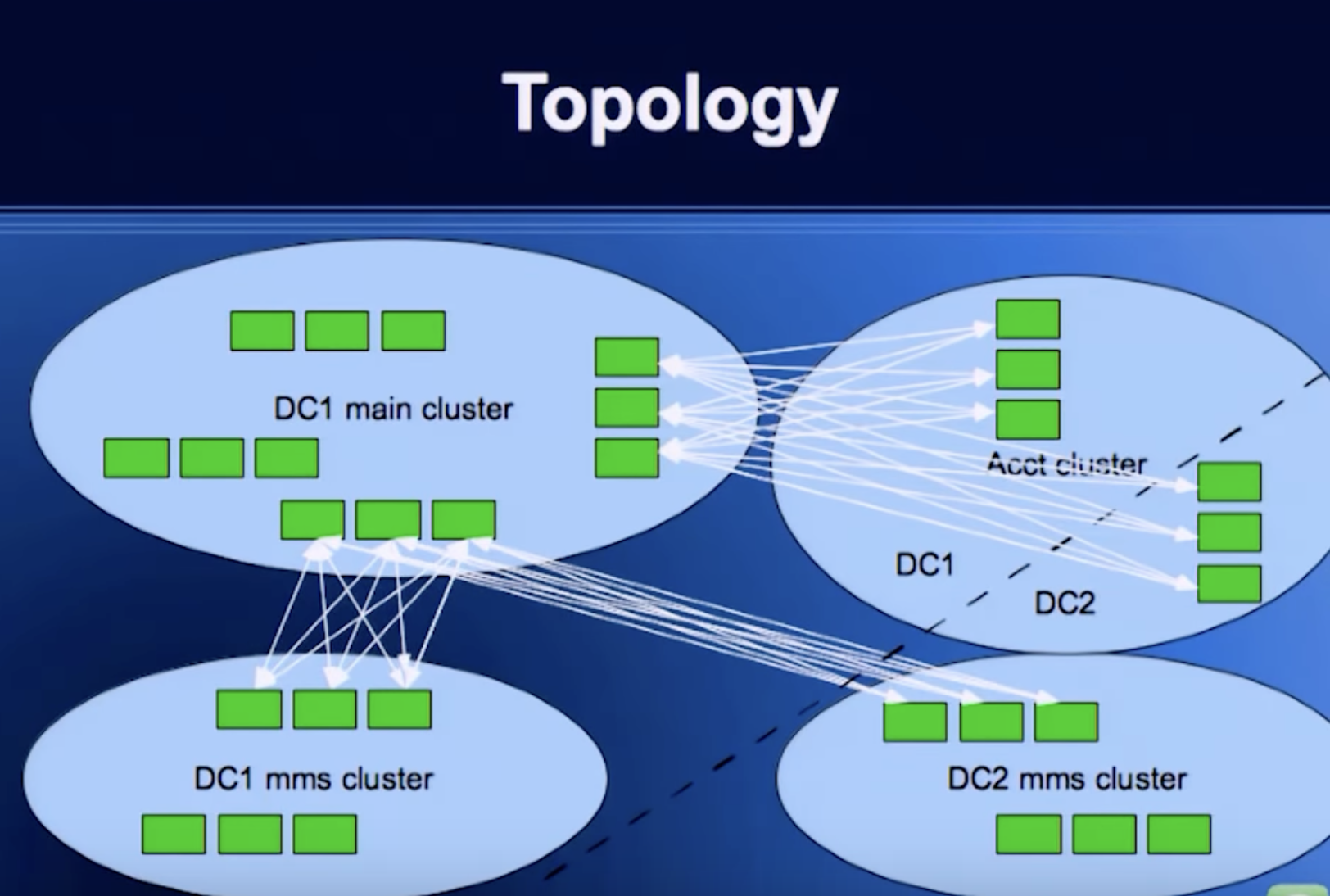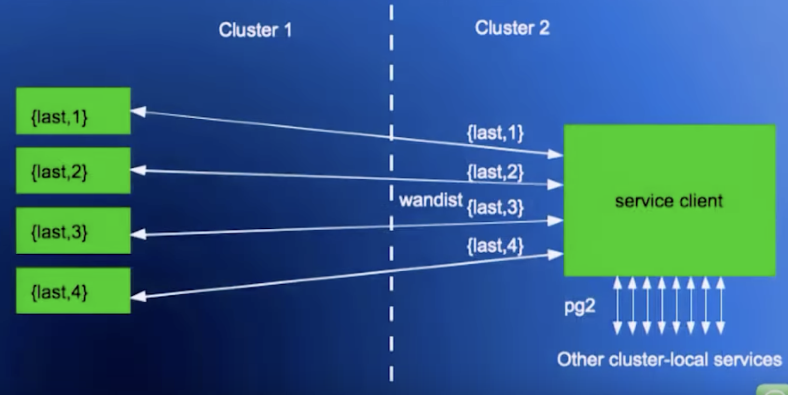- Layer over Erlang’s usual all-nodes-connect-to-all-nodes mesh (called pg2) that maintains cross-DC connections over TCP, but only for node pairs that need to talk to each other