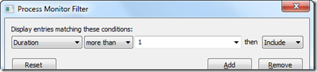 After I rebooted, I logged on, waited for five minutes looking at a black screen, then finally got to my desktop, where I ran Process Monitor again and saved the boot log. Instead of scanning the several million events that had been captured, which would have been like looking for a needle in a haystack, I used this Process Monitor filter to look for operations that took more than one second, and hence might have caused the slow down:
