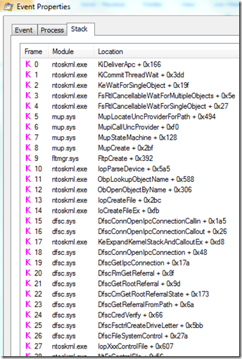 My eye was drawn to a pattern of the same four threads sampled every second throughout the entire black-screen period. The stack of the third thread was much more interesting. It was many frames deep, including calls into functions of the Multiple UNC Provider (MUP) and Distributed File System Client (DFSC) drivers, both related to accessing file servers: