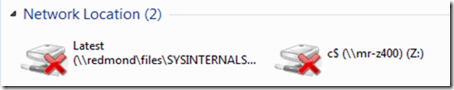 The next frame’s function, WNetRestoreAllConnectionsW, combined with the deeper calls into file server functions, led me to conclude that Winlogon was trying to restore file server drive letter mappings before proceeding to launch my shell and give me access to the desktop. I quickly opened Explorer, recalling that I had two drives mapped to network shares hosted on computers inside the Microsoft network, one to my development system and another to the internal Sysinternals share where I publish pre-release versions of the tools. While at the conference I was not on the intranet, so Winlogon was unable to reconnect them during the logon and was eventually – after many minutes – giving up: