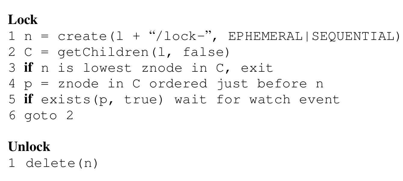 - Simple Locks: create an ephemeral znode. If the znode is created, you hold the lock. When the lock is released, all waiting clients vie for the lock (herd effect), which could be an issue.