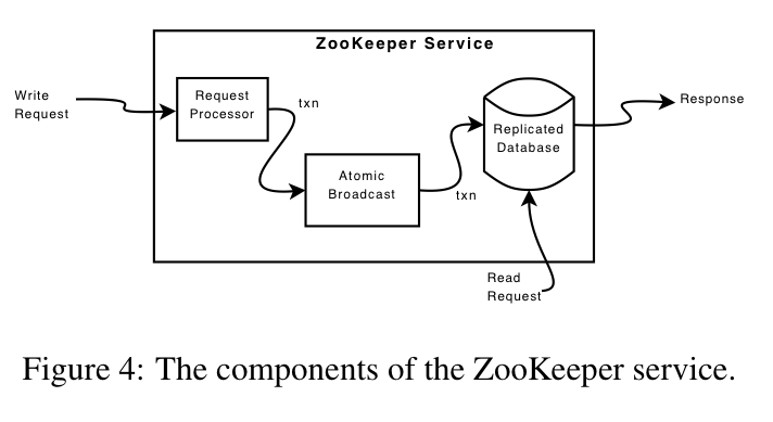 Figure 4 shows the highlevel components of the ZooKeeper service. Upon receiving a request, a server prepares it for execution (request processor). If such a request requires coordination among the servers (write requests), then they use an agreement protocol (an implementation of atomic broadcast), and finally servers commit changes to the ZooKeeper database fully replicated across all servers of the ensemble. In the case of read requests, a server simply reads the state of the local database and generates a response to the request.